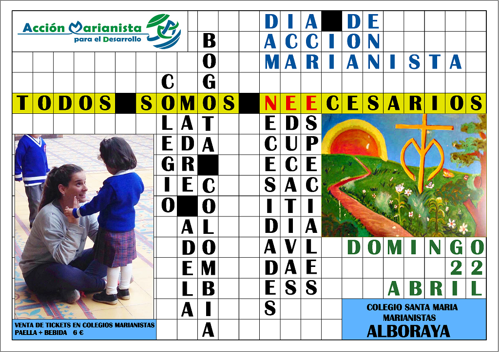 El próximo domingo día, 22 de abril de 2018, se celebrará el Séptimo Día de la Solidaridad en Valencia, organizado por la Delegación Local de la Fundación Acción Marianista, una jornada lúdico-informativa, que se celebrará durante todo el día en el patio del Colegio Santa María (Marianistas) de Alboraya con el objetivo de fomentar el voluntariado y la recogida de fondos para la creación de un aula para Alumnos con Necesidades Educativas Especiales en el Colegio Madre Adela de Bogotá (Colombia). Precio del Ticket 6,00 €