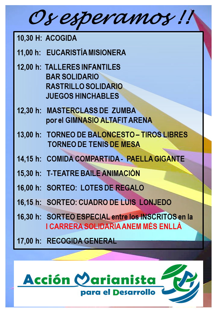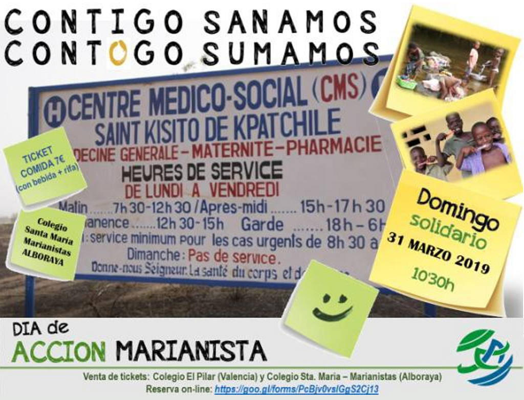 El próximo domingo día, 31 de marzo de 2019, se celebrará el Octavo Día de la Solidaridad en Valencia, organizado por la Delegación Local de la Fundación Acción Marianista, una jornada lúdico-informativa, que se celebrará durante todo el día en el patio del Colegio Santa María (Marianistas) de Alboraya con el objetivo de fomentar el voluntariado y apoyar los proyectos sanitarios que se desarrollan en Togo, con compra de medicamentos y equipos sanitarios y con compra de kit para análisis, prevención y apoyo, y material para el centro médico social Saint Kisito, en Kpatchile. Precio del Ticket 7,00 €